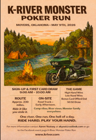 Brett will lead a ride to the K River Campground to support Mile Monsters on a poker run. Anyone that would like to ride up is more than welcome. We will make 1 stop on the way approximately half way up for a Bio Check and rest.